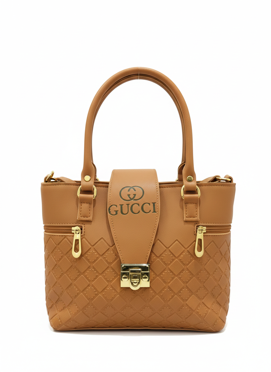 Elegant tan handbag crafted with premium textured leather, featuring a structured silhouette and iconic front logo. Designed with sturdy top handles, secure lock closure, and refined detailing—perfect for everyday sophistication or special outings.